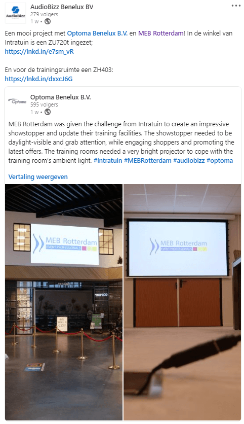 MEB AV supplies various beamers / projectors. For temporary projections we use tension screens. Combined with scalers/switchers and other peripheral equipment we provide sharp, image-filling presentations and we can switch seamlessly between different presentations, (corporate/promotional) films, logos or for example live-camera images. Working with a combination of different resolutions is no problem. If desired, the projections can also be hidden from view with see-through screens. If there is little space for the projector we work with ultra short throw lenses and mirror constructions.